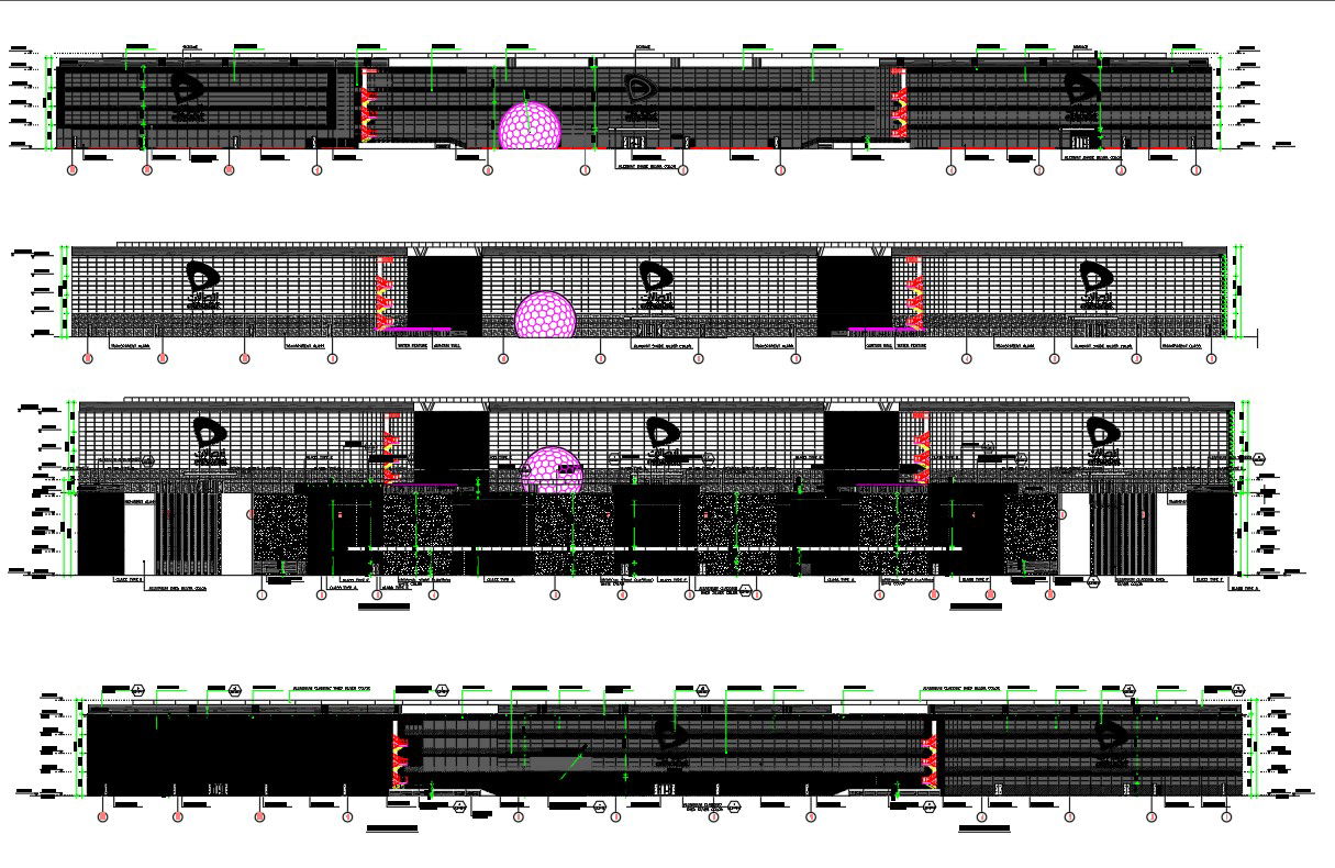 Drawing shows the elevation of office building in the Autocad 2D model. Types of material used, material details, dimensions of floor, door details were given in this drawing model. Glass type, revolving door, water future, curtain wall, transparent glass, wall mounted monorail, aluminium cladding, silver door and artificial stone plasters were mentioned in this model. Thank you for downloading the cad file and other program file from our website.