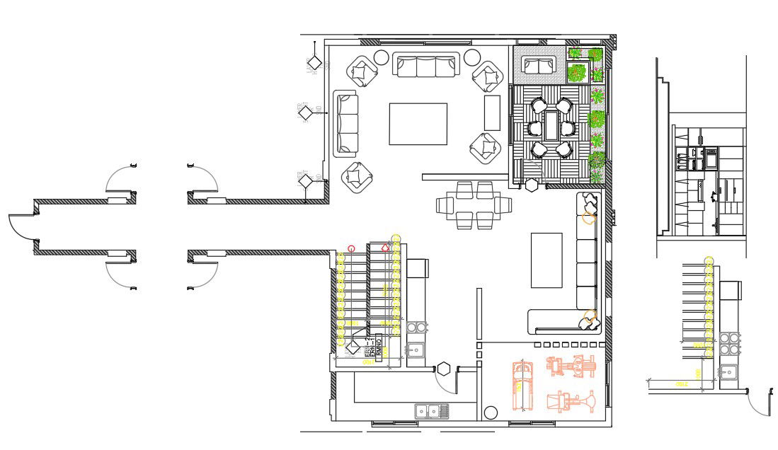 The 2D Autocad DWG drawing file has the house plan details. The house plan having the living hall, kitchen, dinning with 6 seater, lounge room, and another hall with sofa sets. Parking were provided for one car, and bike. Stairs were shown in this drawing file. This plan has done with furniture. Thank you for downloading the cad file and other program file from our website.
