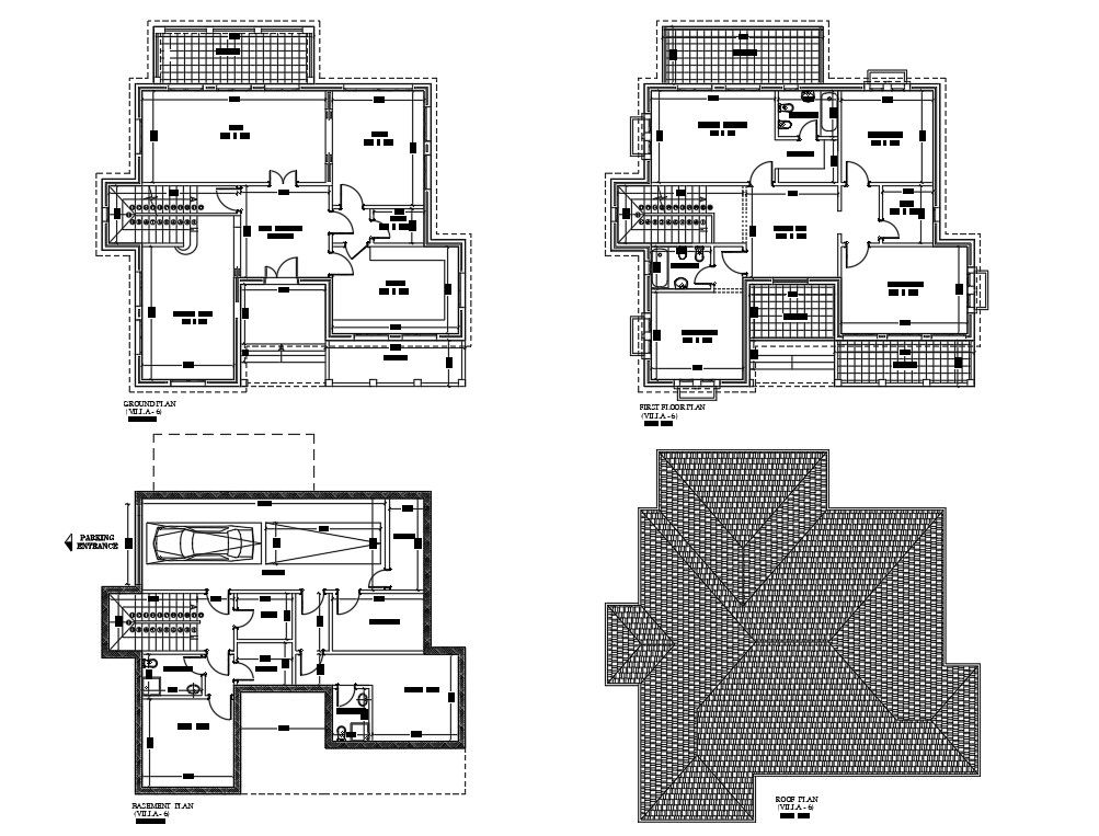 AutoCad 2D drawing file having the Individual villa floor plan with Basement car park facilities(Villa House Floor Plan). A villa is a type of house that was originally an ancient Roman upper-class country house. ... In modern parlance, "villa" can refer to various types and sizes of residences, ranging from the suburban semi-detached double villa to residences in the wildland–urban interface.Each buildup area is given clearly in this DWG file.The building plan has basement ,ground floor ,first floor plan and roof floor plan. The dimension of each floor is clearly given in this drawing file. The rooms are Family Room kitchen, bedroom with attached toilet and common toilet, store room, dinning, maid room, driver room &laundry room and CAD block diagram for house is available Download the AutoCAD 2D DWG file. Thank you so much for downloading DWG file from cadbull website.