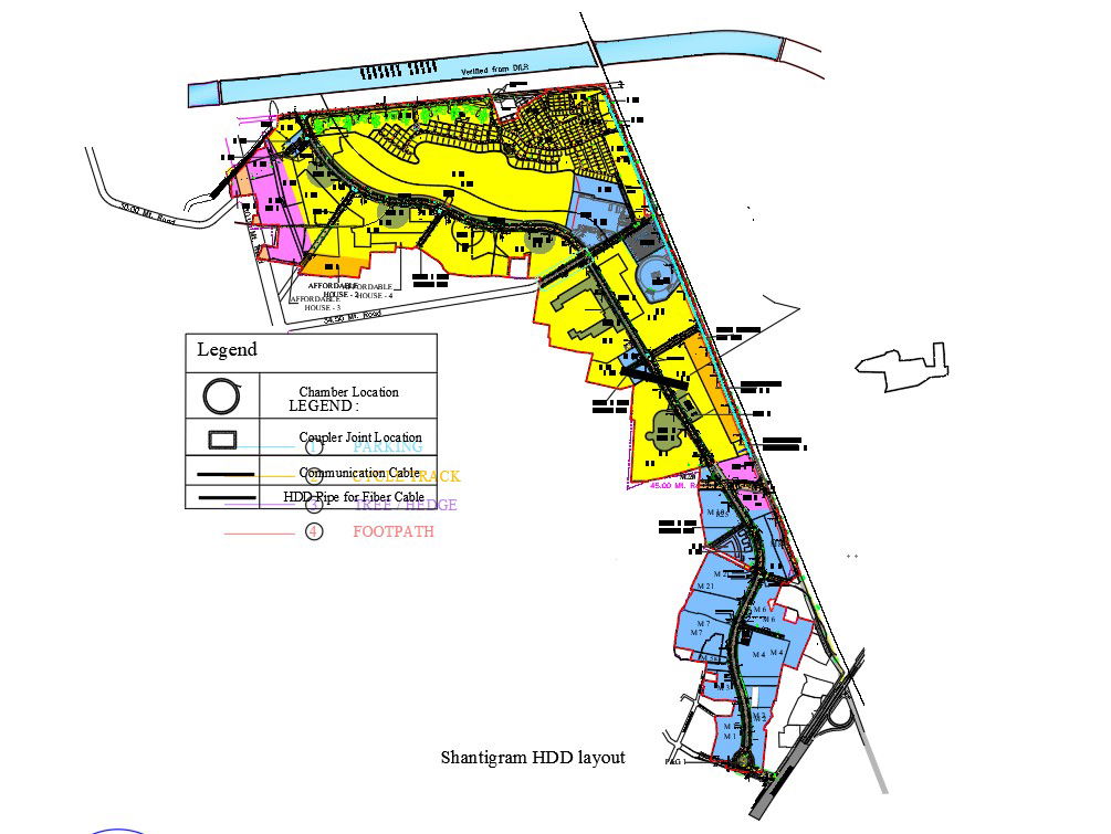 Fibre layout of shantigram Horizontal directional drilling(HDD) has given in the form of Autocad 2D dwg drawing file. Download the Autocad DWG drawing file.