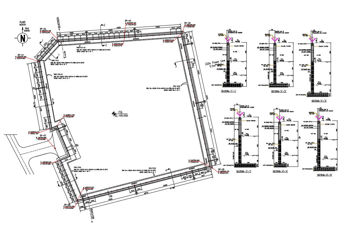 Boundary wall layout were given in the Autocad 2D DWG drawing file. In this file raft footing sections were given. Download the Autocad DWG drawing file.