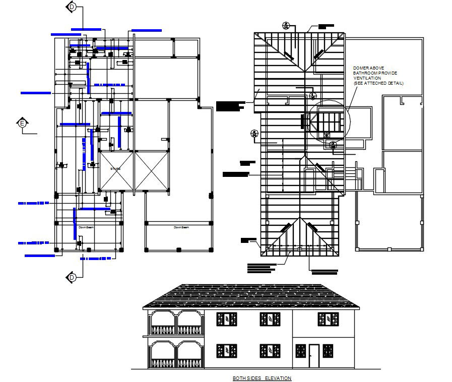 Joint house plan AutoCAD drawing includes floor plan, truss span roof structure detail, and also has 2 storey floor level building elevation design. Download house project drawing DWG file. Thank you for downloading AutoCAD DWG drawing file from the our website.
