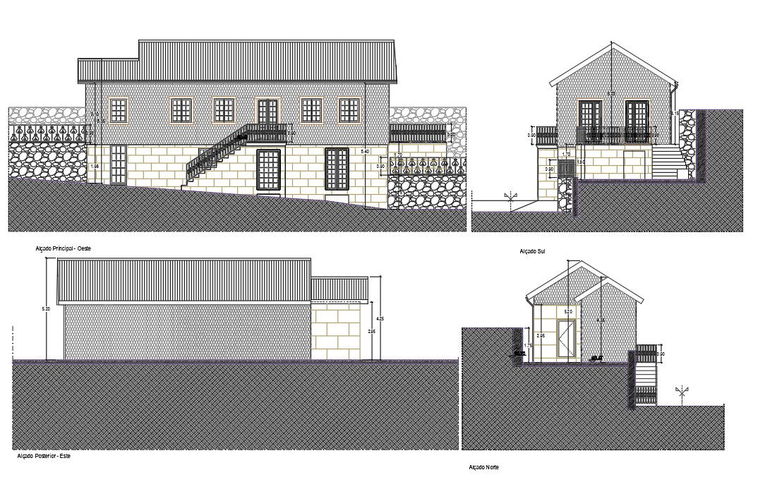 The file has the elevation of house - deployment plant surveying overlay in the 2D Autocad model. Resorted existing wall, top view, side elevation - south, rear elevation - west, side elevation - north and section AA were mentioned clearly. Doors, windows, brick work and staircase were shown in this file. Thank you for downloading the file and other CAD program from our website.