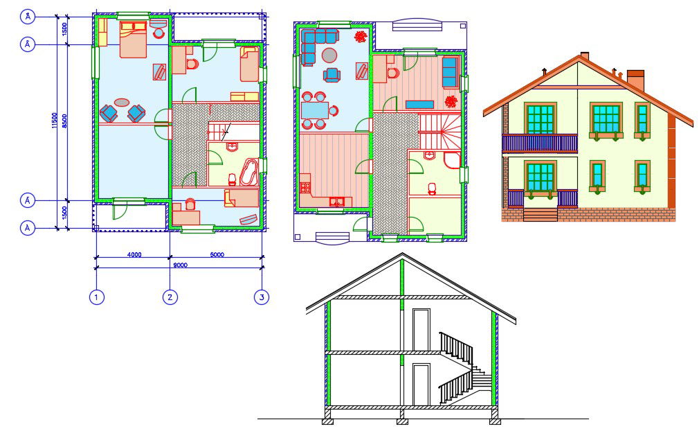 2 Storey House Floor Plan With House Building Front Elevation And Section Drawing DWG File