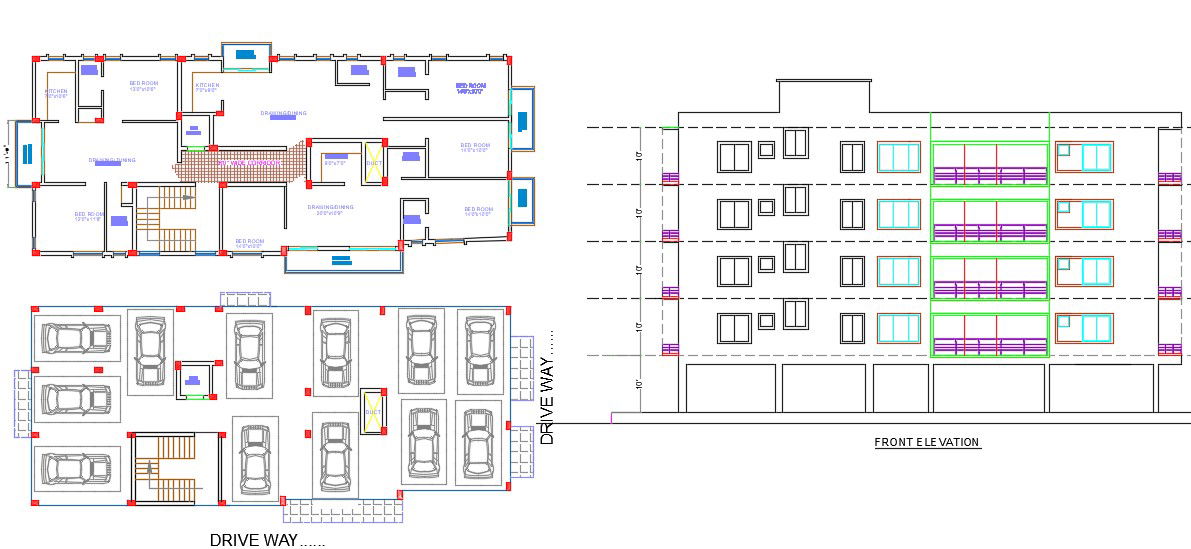 35'X84' typical apartment 3 unit house layout plan CAD drawing includes 2 bedrooms, kitchen, toilet, drawing room with balcony, dining area, staircase and lift. also has ground floor plan for car parking lot and 4 storey floor level building elevation design. download 2 BHK apartment layout plan drawing with all measurement detail DWG file.