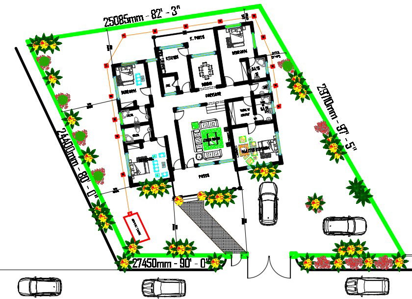 The architecture house master layout plan CAD drawing includes 4 master bedrooms with attached toilet, kitchen, living room, dining room, porch area, car parking ground, and landscaping design with boundary compound wall design. also has sewage line network connect with septic tank. download 4 BHK house master plan with furniture layout drawing DWG file.