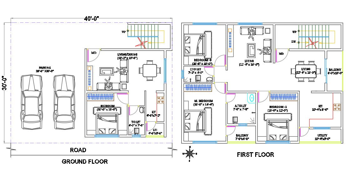 30'X40' House Ground Floor And First Floor Plan CAD Drawing DWG File