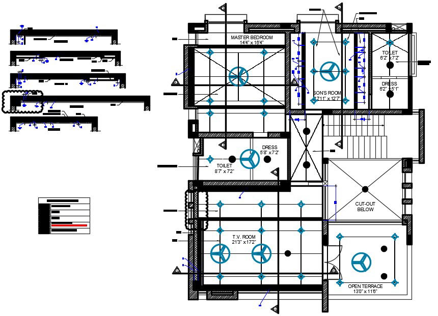 The residence house with electrical layout design which consist tv room, dressing room, master bedrooms, children room, toilet and open terrace for sitout. also has marking ceiling false light and fan, material and ceiling level legend, exiting slab level, and RCC slab lintel level detail. download residence house electrical plan CAD drawing DWG file.