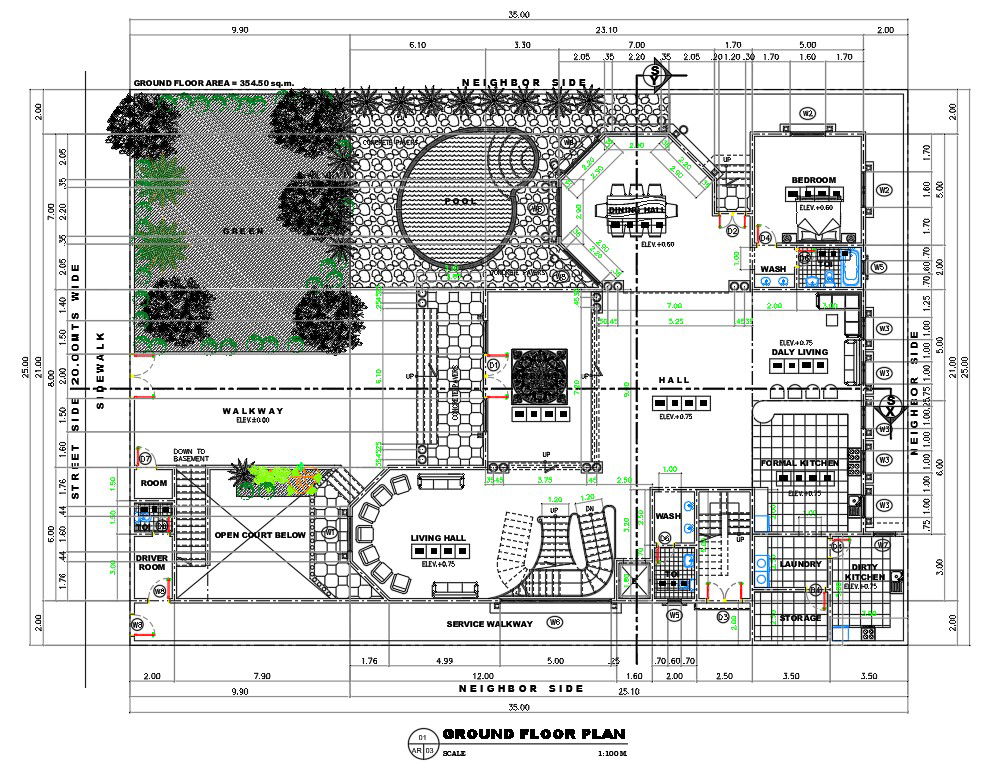 2D Autocad DWG drawing file has the ground floor plan of the two storey residential building plan. Concrete pavers were provided around swimming pool. This helps prevent any differential movement that may occur between the pool and the paving. Make sure that there is an expansion joint between the pool coping and the paving, or between the pool and the paving. Thank you for downloading the autocad file and other CAD program from our website.