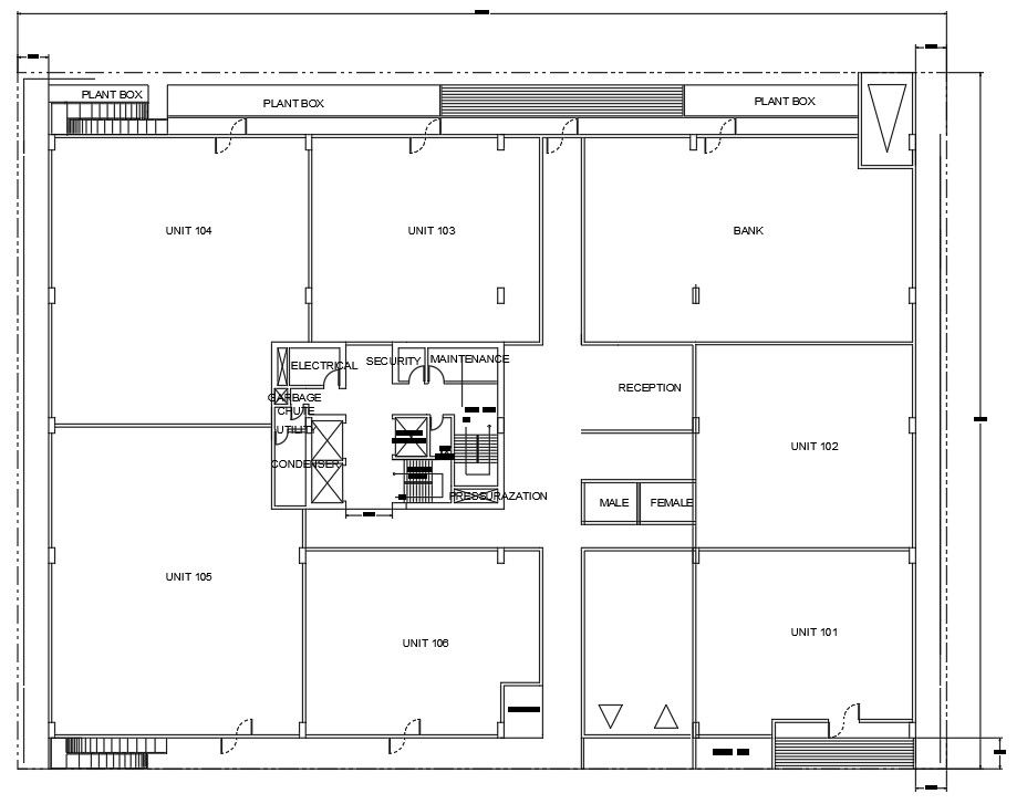 In this drawing you will have a floor plan of commercial site.There are one bank and some other unit placed. more detail about staircase and services.maintenance garbage chute and fire exits ,elevator also dawn in this drawing. Download Autocad 2d Drawing file.