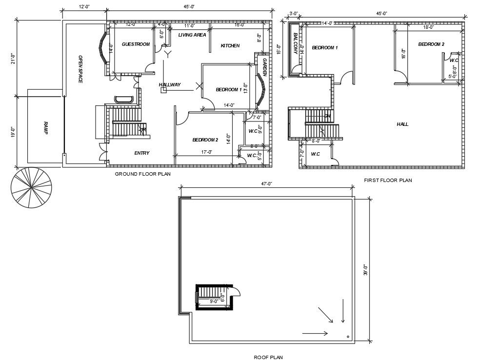 In this AutoCAD drawing given 57' x 40' ft.' residence planning file. There are one hall way kitchen area ,guest room, and 2 bedroom designed in this drawing file.And also in first floor two more bedroom placed with attached toilet. Download Autocad 2d Drawing DWG file.