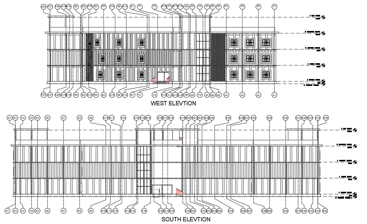 Hospital Building West and south side elevation details are given in this AutoCAD DWG file.Download the AutoCAD Drawing file.