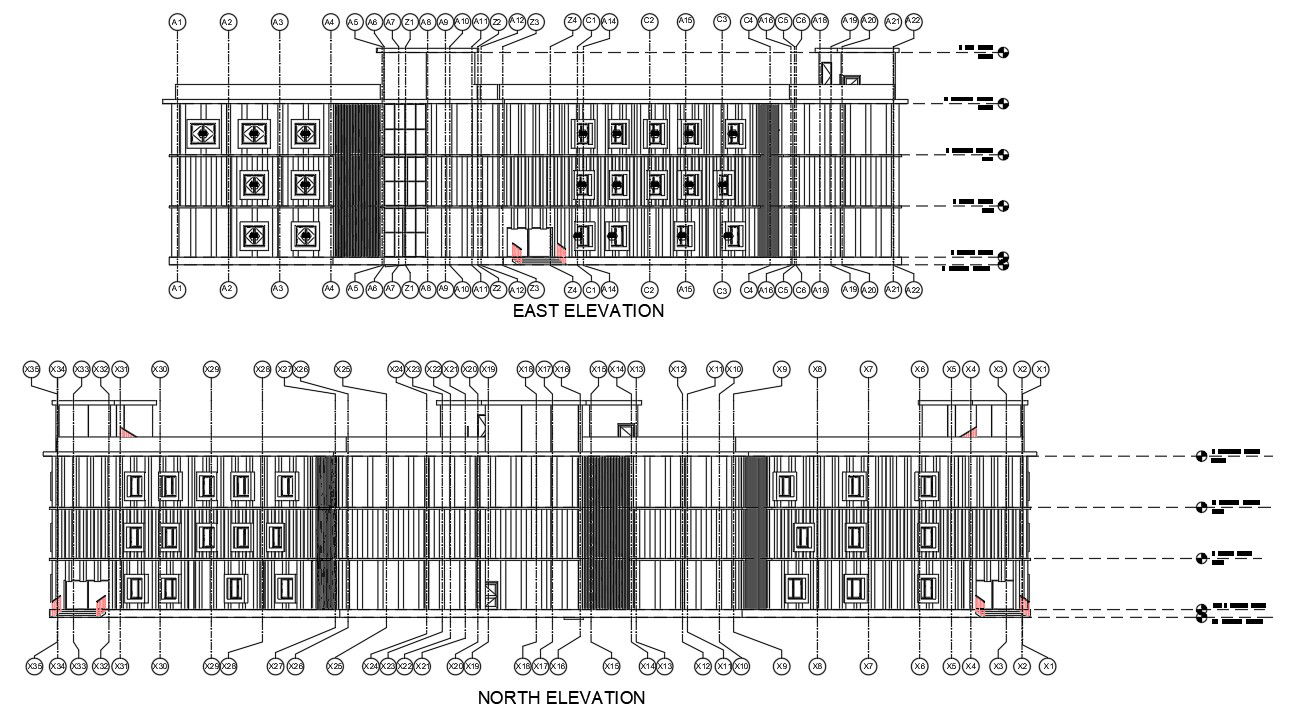 Hospital Building East and North side elevation details are given in this AutoCAD DWG file.