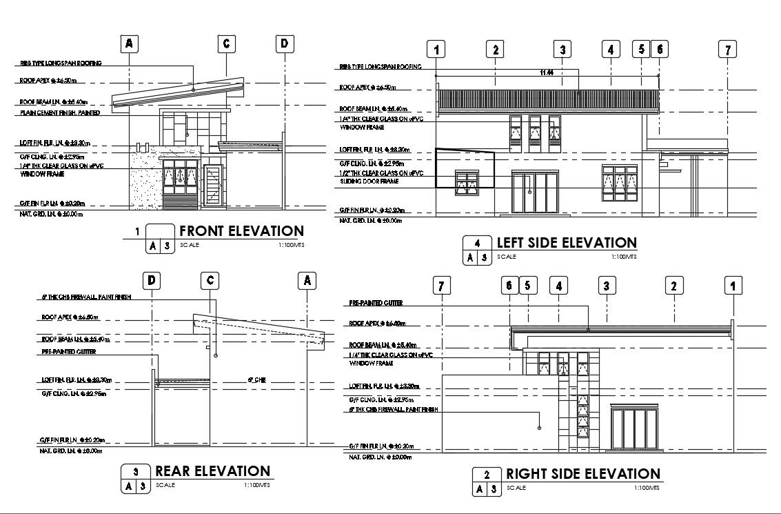 This drawing file shows elevation and section detail of residence project.In this drawing lest side elevation,right side elevation,rear elevation,front elevation with all dimension details.This drawing made in 1:100 scale.Download the AutoCAD 2D DWG file.