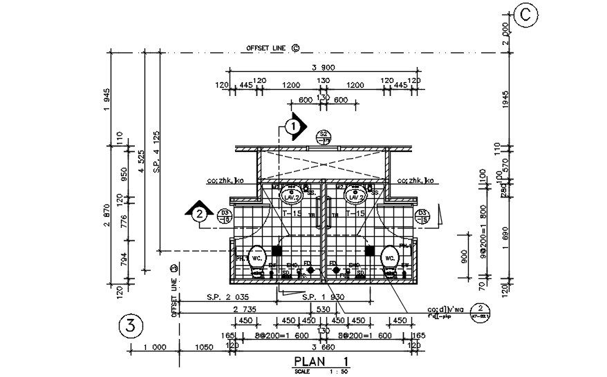 Autocad 2D DWG drawing file show the details of the Toilet plan of the hospital building. Lavatory, water closets and doors are specified here. Other details were given with the measurements. All dimensions are in mm. Download the Autocad drawing file. Thank you for downloading the autocad file and other CAD program from the our cadbull website.