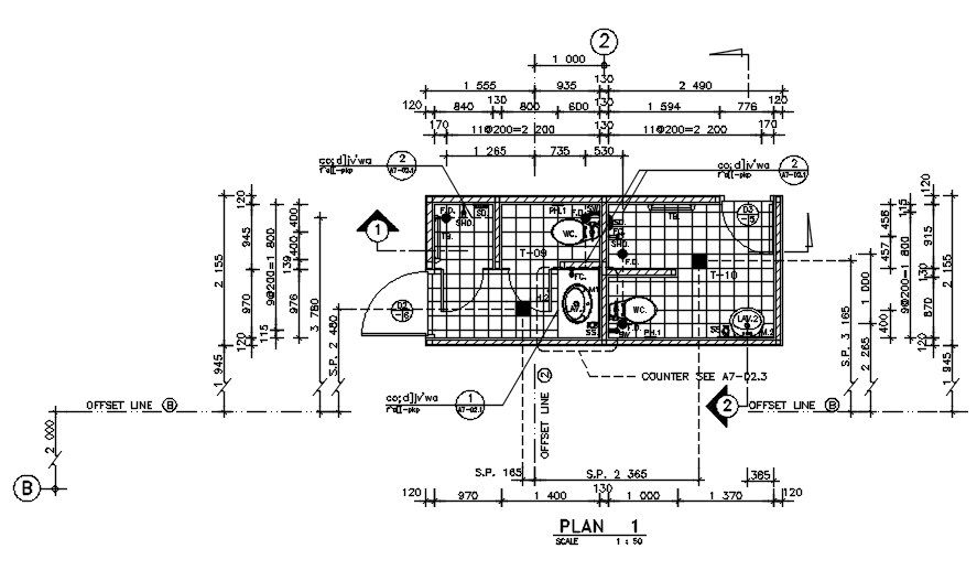 :50 scales with naming and dimensions.there are two blocks of separate toilet with sanitary blocks and door detail. In this drawing indicated the start point and endpoint of tiling also. Download the 2d AutoCAD drawing file.