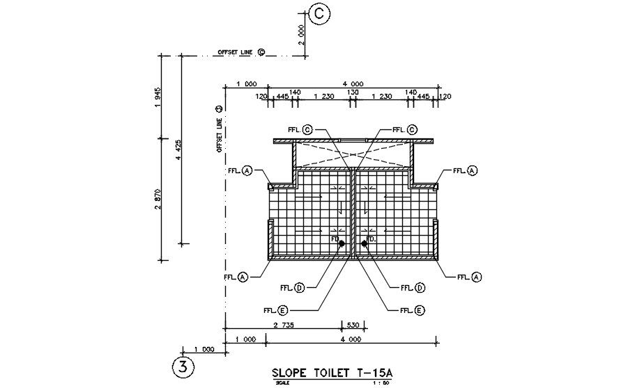 Slope toilet of tT-15A of the hospital building were given in the Autocad 2D DWG drawing file. In this drawing floor finished level were done around the toilets to avoid the obstacles of water flow from floor tiles to outlet filter. Thank you for downloading the Autocad file and other program file from our website.