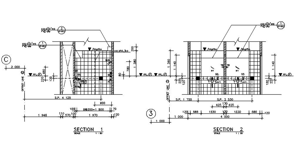 Section details of the lavatory of hospital building were shown in the Autocad 2D DWG drawing file. Download the Autocad DWG drawing file.