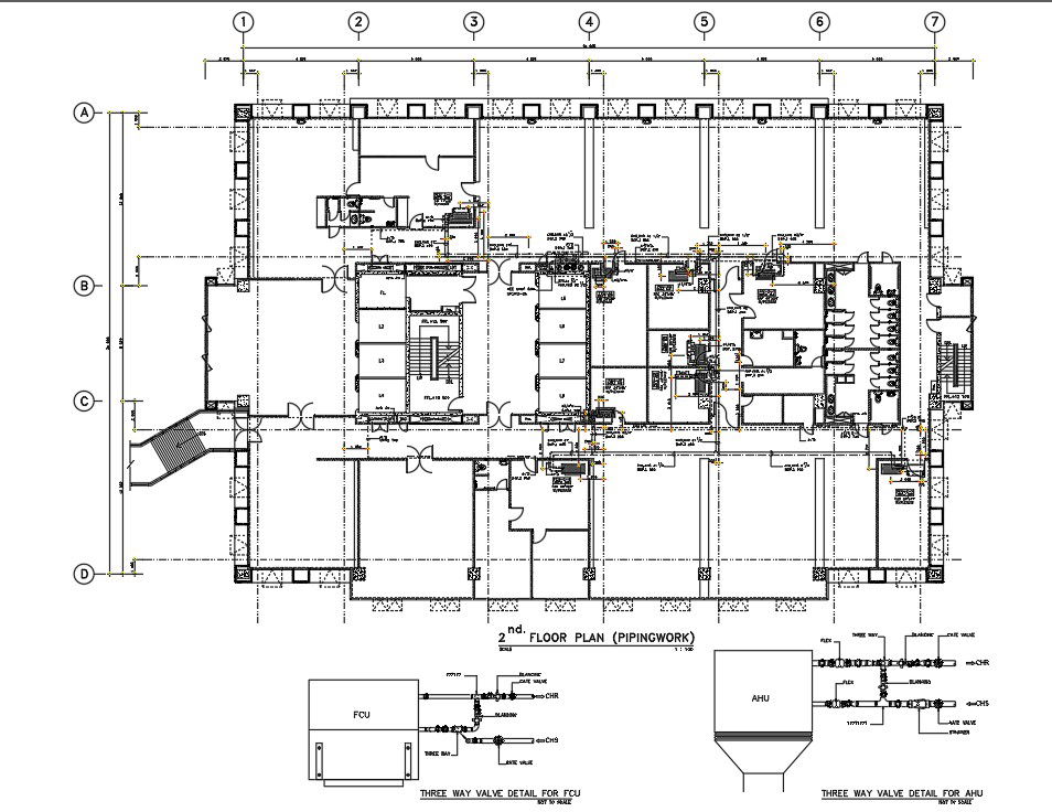 Piping work of the second floor of hospital building details are given in the 2D Autocad DWG drawing file. Three way valve details are given for the fan coil unit and air handling unit. The purpose of a 3-way control valve is to shut off water flow in one pipe while opening water flow in another pipe, to mix water from two different pipes into one pipe, or to separate water from one pipe into two different pipes. A 3-way valve is normally provided with an electrical, pneumatic or thermal actuator. Thank you for downloading the autocad 2D DWG drawing file and other CAD program files from our website.