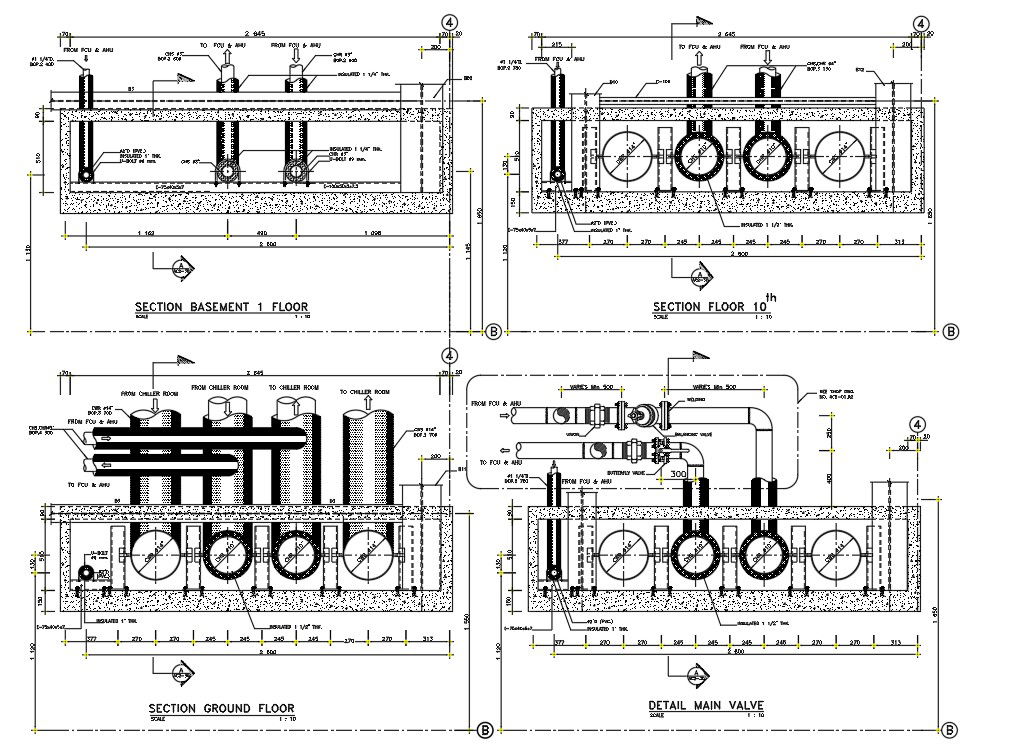 Section Details main valve of chill water riser is given in the autocad DWG drawing file. Download the autocad file.
