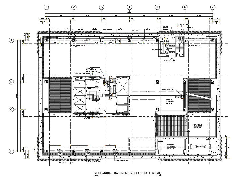 The basement plan of the Mechanical part is given in this drawing. specified duct detail also is given in this drawing with dimensions.drawing created on a 1:100 scale. services detail and beam-column detail is given in this drawing with texting and dimensions detail. Download this 2d AutoCAD dwg drawing file.