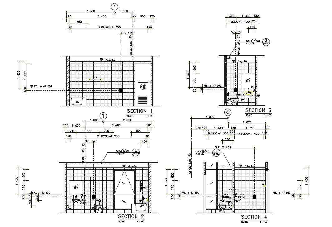 Section details of the toilet room are given in this 2D Autocad DWG drawing file. There are four toilet rooms are provided in this drawing. washbasin, bathtub, western toilet, and shower block are given. Dimensions like length, breadth, and depth were given clearly. Download the Autocad DWG drawing file. Thank you for downloading the Autocad file and other program files from our website.