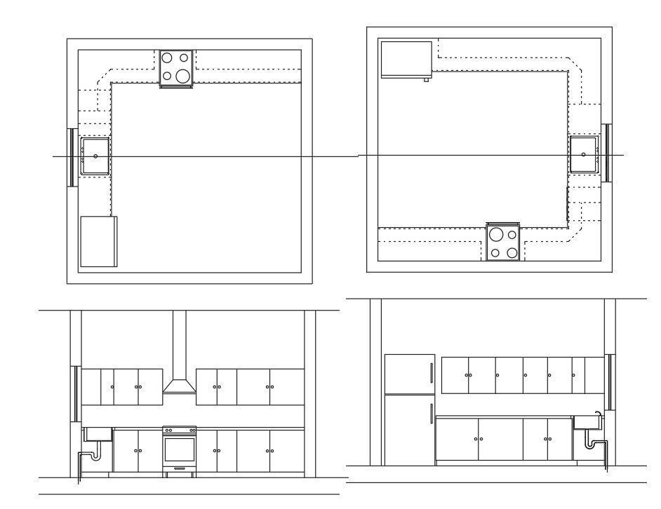AutoCAD DWG showing the CAD blocks for a kitchen. The frontal view and top view of the kitchen is provided in the Plan. The CAD Blocks of cooktops, microwaves and chimney are also projected. Download the AutoCAD 2D file from our website.