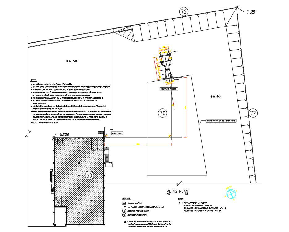 AutoCAD 2D model of the Piling Plan with pile reinforcement details.The sectional details of the pile is described with its acceptable compressive an tension load characteristics. Download the AutoCAD file from our website.