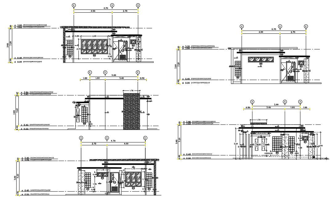 AutoCad DWG file showing front elevation of a house plan. Download the AutoCAD 2D file