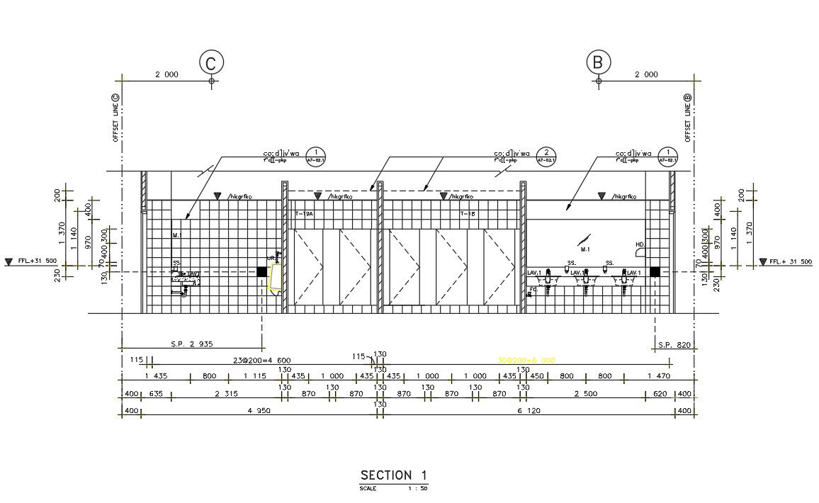 Section detail of toilet drawing given in this file. In this drawing three basins front elevations and side elevation of the basin . Also, wall tiling detail is shown in this file with the start and endpoint.this drawing made by a 1:50 scale. Download this 2d AutoCAD drawing dwg file.