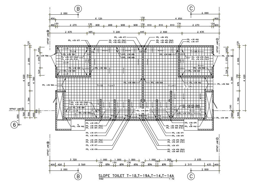 In this drawing flooring detail given of toilet. flooring detail is given in this drawing with slop detail and start point and endpoint of tiling. also given level detail with dimensions. this drawing is drawn by a 1:50 scale. Download this 2d AutoCAD drawing file.