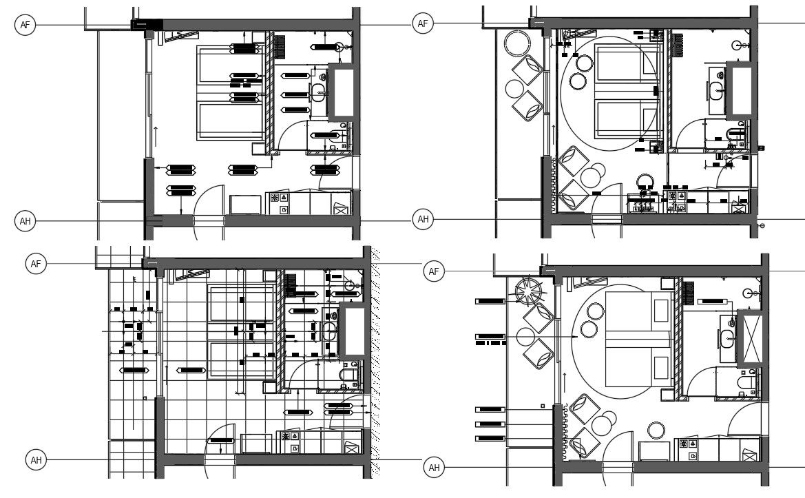 AutoCAD DWG Architectural Drawing file having the details of the Hotel room floor plan with the attached toilet and the furniture design. Sectional details are clearly given in this drawing file. The hotel Layout plan shows a room, beds and furniture, western toilet block, toilet, and washbasin in this DWG file. A total of four rooms are available with toilets. Download the AutoCAD 2D DWG file. Thank you so much for downloading the DWG file from our website.