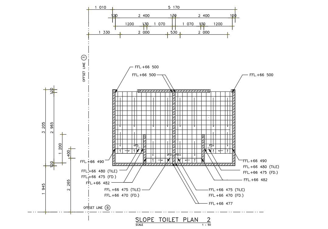 Slope toilet plan details is given in this 2D Autocad DWG drawing file. Download the Autocad DWG drawing file.