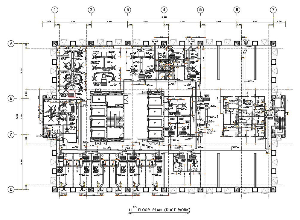 Duct work of hospital building floor plan (11th floor ) has given in the form of Autocad DWG drawing file.  Download the Autocad DWG drawing file.