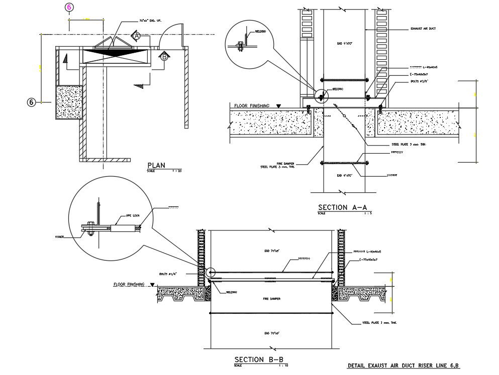 Section details of exhaust air duct riser in autocad 2D DWG drawing file. Steel plate, fire damper, bolts, welding, gift lock and exhaust air duct are mentioned in this drawing file. Plan and section details are given clearly. Thank you for downloading the Autocad 2D DWG drawing file and other CAD program files from our cadbull website.