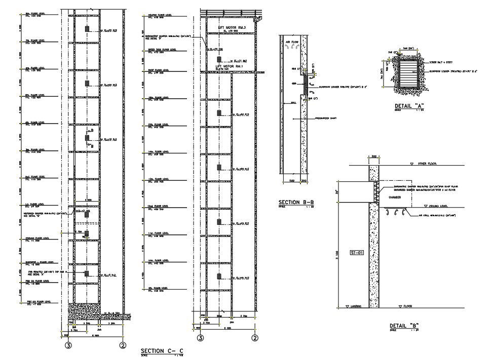 Section drawing of floor area ratio of hospital building is given in the Autocad DWG drawing file. The floor area ratio (FAR) or floor space ratio (FSR) denotes the maximum floor space that can be constructed on a given piece of land. In other words, it is a ratio between a building's total constructed floor area and the land area. In this drawing two section details are given. Floor stars from Parking Basement 3 to 8th floor and from 8th helipad floor level. For more details download the autocad DWG drawing file. Thank you for downloading the Autocad DWG drawing file and other CAD program files from our cadbull website.