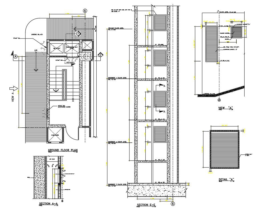 Section, ground floor, plan, view and details of fireman lift lobby is given in this autocad DWG drawing file. Download the Autocad DWG drawing file.