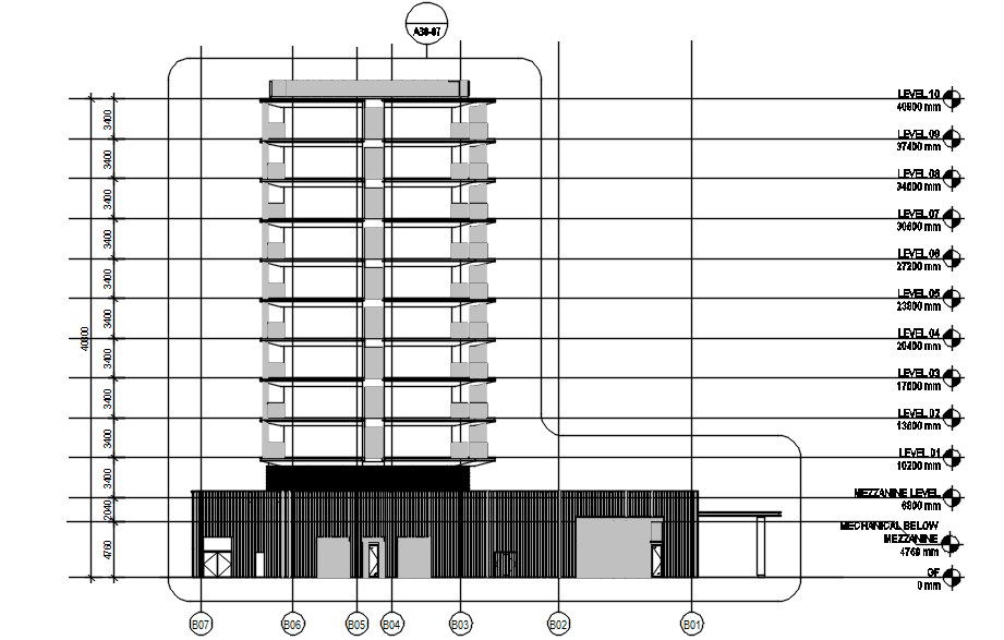 Stilt +10 beautiful side Elevation of the hotel building is given in this AutoCAD DWG File. Download the AutoCAD DWG file now.