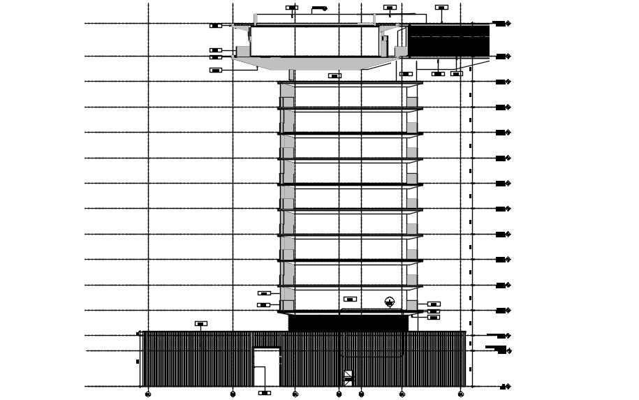 southside Detailed Elevation of the Stilt +10 Hotel building is given in this AutoCAD DWG 2D Drawing File. In this file, the staircase, door, and windows were clearly shown. The section details were also are given clearly in this drawing. Download the AutoCAD DWG file now. Thanks for downloading the file and another CAD program from the cadbull.com website.