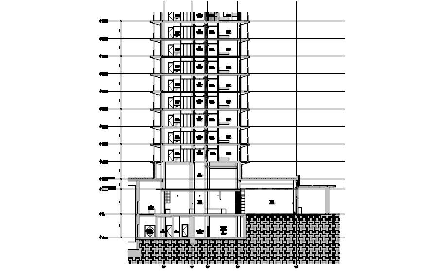 Detailed Typical section plan of G+12 Hotel building is given in this AutoCAD Drawing File. In this file, the staircase, door, and windows, balcony view and compound wall were neatly shown. The section detail and the dimension were also are given clearly in this drawing. Download the AutoCAD DWG file now. Thanks for downloading the file and another CAD program from the cadbull.com website.