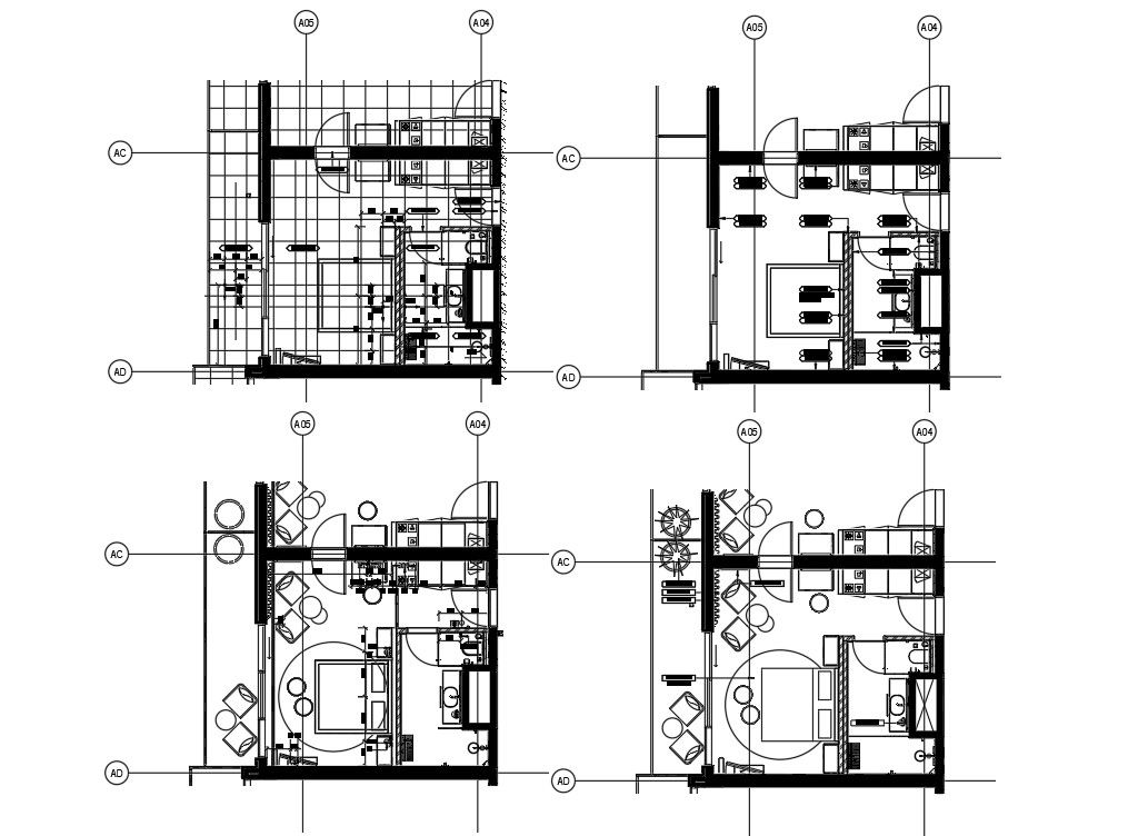 AutoCAD DWG file showing Detailed plan of a standard Suite room of a Star hotel The CAD blocks of a large bedroom with a siting area provided with chairs. Small Power Plan, Artwork& Accessories Plan, wall finishing Plan, Floor finishing Plan of the room are also available. Download the AutoCAD 2D file from our Website.