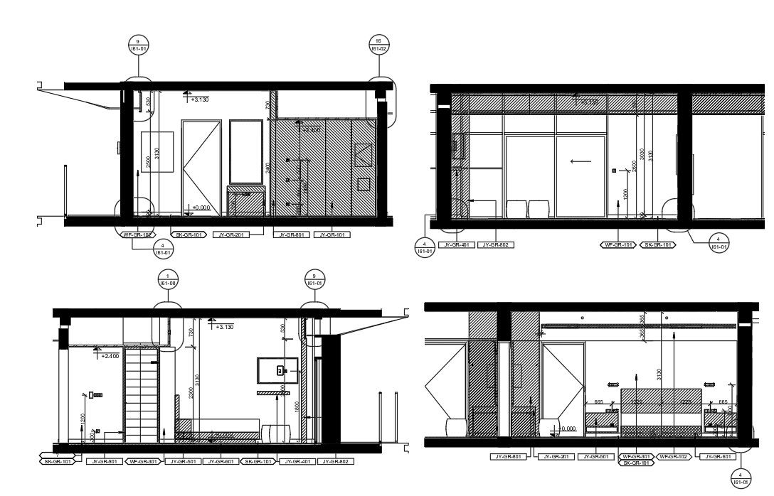 AutoCAD DWG file showing section plan of a standard Suite room of a Star hotel The CAD blocks of a large bedroom with a siting area provided with chairs. four sided Elevation of the room are provided in the plan. Download the AutoCAD 2D file from our Website.