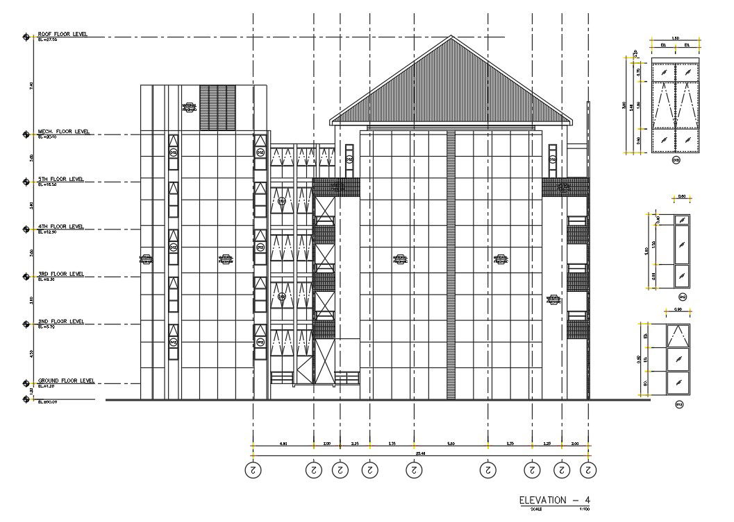 CAD DWG drawing file shows the details of hospital building elevation. 24mm thickness of insulating glass projecting windows, concealed frame anodise natural color aluminium for projecting windows are provided. For more details download the autocad file. Thank you for downloading the 2D Autocad file and other cad files from our website.