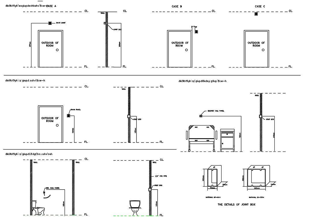 Nurse call system details are given into the autocad DWG Drawing file. In this drawing out door of room, door light, joint box, wall, ceiling level, bedside call panel and floor level are mentioned. Length and breadth details are given clearly and all dimensions are in mm. Thank you for downloading the 2D Autocad file and other cad files from our website.