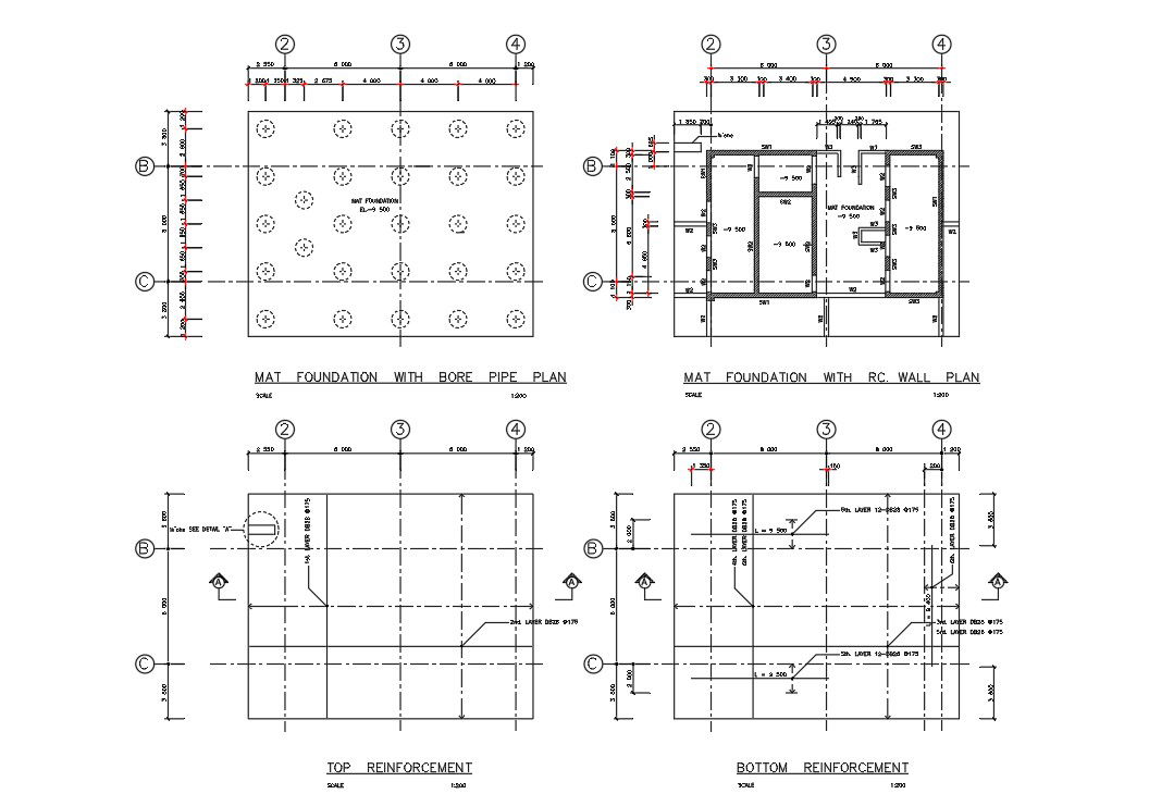 Mat foundation details are given into the atucad 2D DWG Drawing file. Mat foundation, is essentially a continuous slab resting on the soil that extends over the entire footprint of the building, thereby supporting the building and transferring its weight to the ground. Bottom reinforcement, top reinforcement, foundation with bore pipe and mat foundation with RC wall plan were given in this drawing file. Thank you for downloading the autocad file and other CAD program files from our cadbull website.