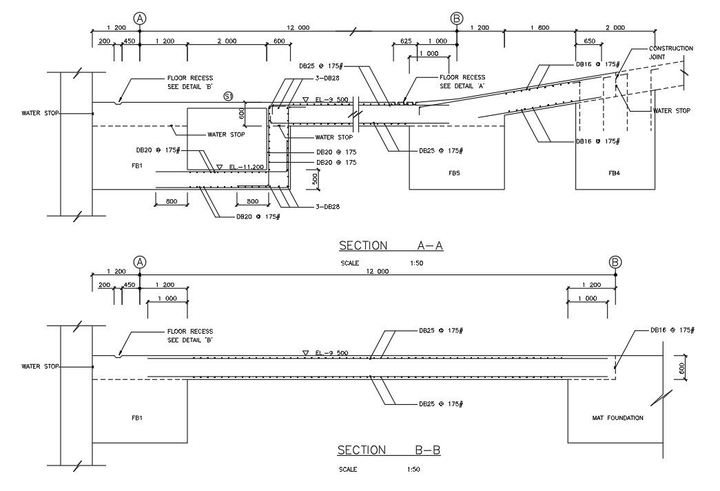 Slab Section details of basement of hospital building is given in this autocad DWG drawing file. Mat foundation is mentioned in this drawing file. Water stops or water bars are flexible tape like elements of a concrete structure that prevent the passage of water through concrete joints. Concrete joints are most liable to seepage. Thank you for downloading the autocad file and other CAD program files from our cadbull website.