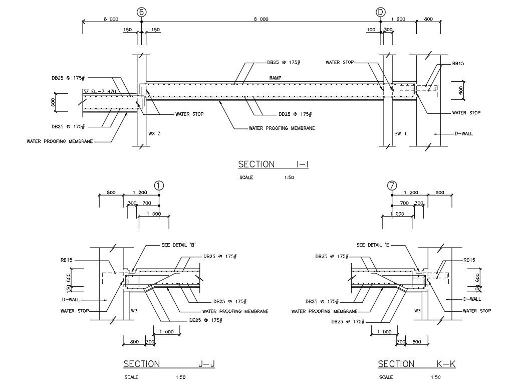 CAD drawing file shows the details of basement floor slab (Hospital Building). In this diagram detail and section were given. Steel box column, water stop, water proof membrane, bottom reinforcement and top reinforcement details were given in the section. Thank you for downloading the autocad file and other CAD program files from our cadbull website.