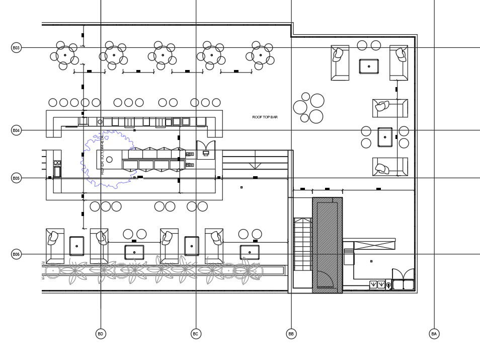 This DWG AutoCAD file includes a hotel rooftop bar floor plan with detailed layout, seating arrangement, and design elements. Architects and interior designers can use this CAD drawing to create precise AutoCAD plans, plan furniture and spaces efficiently, and implement accurate bar design layouts.