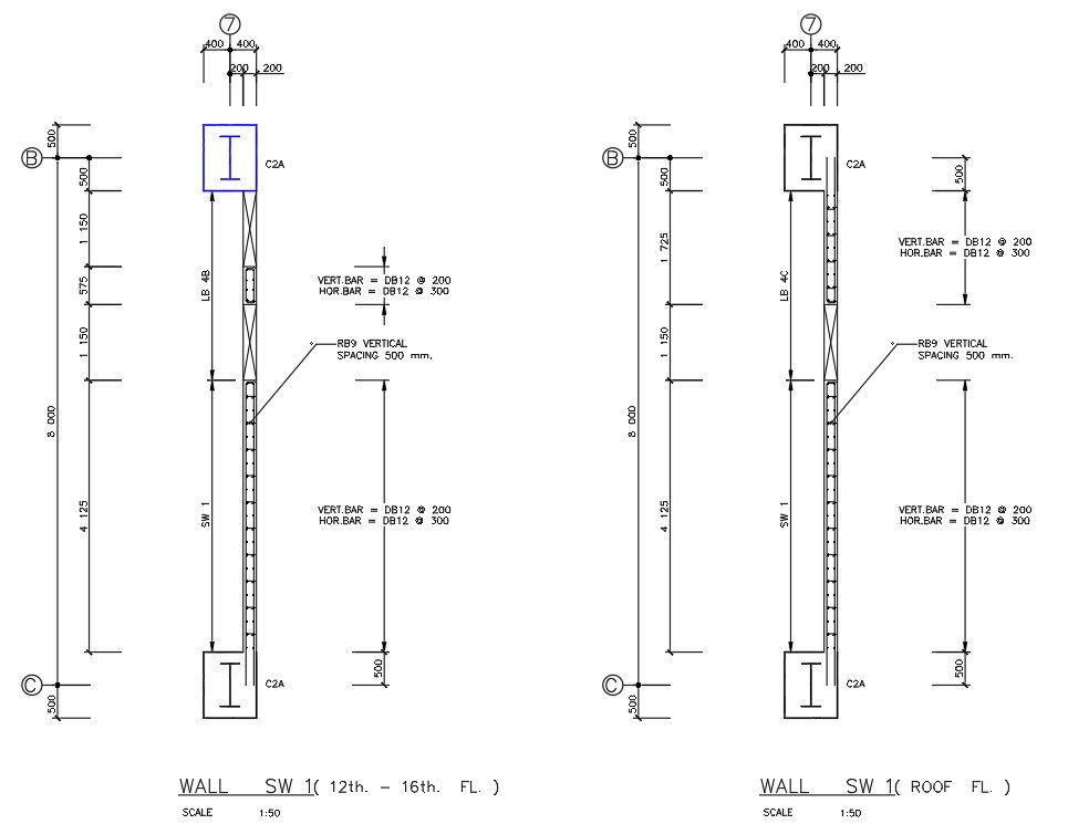 The wall section Reinforcement details of roof and 12th to 16th floor are given in this AutoCAD DWG file. Download the AutoCAD 2D DWG file now.
