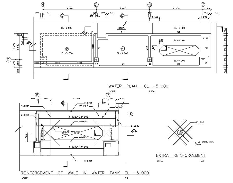 Reinforcement of wale in Water Tank section details is given in this AutoCAD 2D DWG Drawing File. In this file, the water tank plan and the reinforcement details were neatly shown. The section detail and the dimension were also are given clearly in this drawing. Download the AutoCAD DWG file now. Thanks for downloading the file and another CAD program from the cadbull.com website.